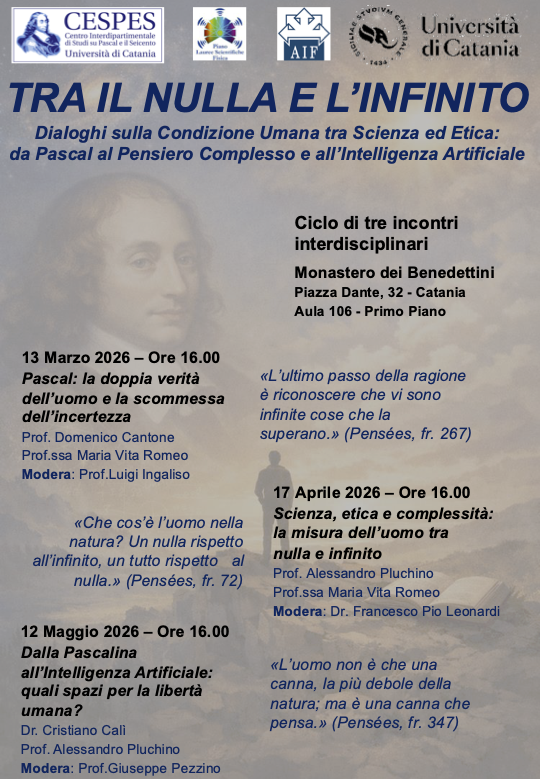 Segnaliamo agli studenti del corso questo ciclo di incontri (si veda la locandina allegata e il relativo link) che possono essere considerati come approfondimenti sulla figura di Pascal e su temi correlati di nostro interesse. Siete tutti fortemente invitati a partecipare (ci si può anche iscrivere dalla pagina dell'evento).